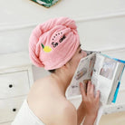 - Bend to make your hair hang down, put on hair towel on top of the head (the end with button)