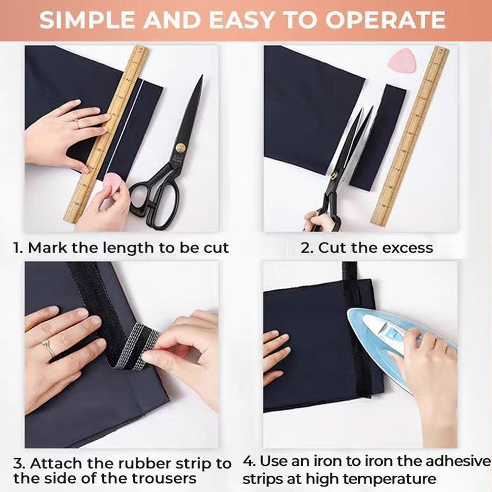 You can cut any length at will, it can be fixed on the pants, and it is not easy to move, and then iron the pants can be flat. Tape the tape for a few seconds, and then it can fit tightly.