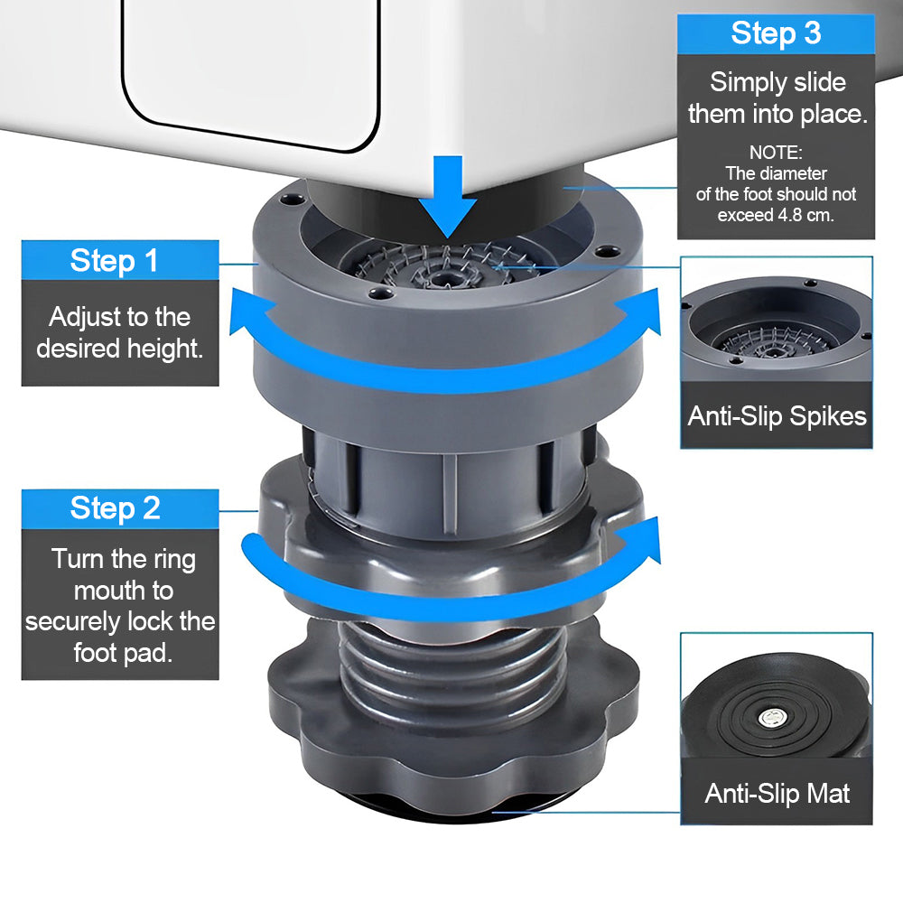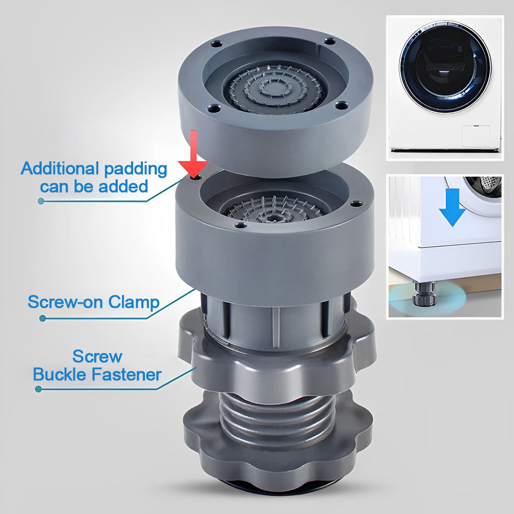 ⚙️ Multi-Purpose Scene Usage: It can be used for washing machines, dryers, and some large furniture. The height can be adjusted according to needs, reducing the vibrations and noises generated by the machine, benefiting floor cleaning and maintenance, while also extending the lifespan of the machine itself.