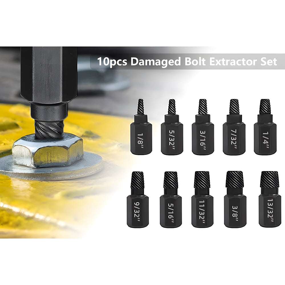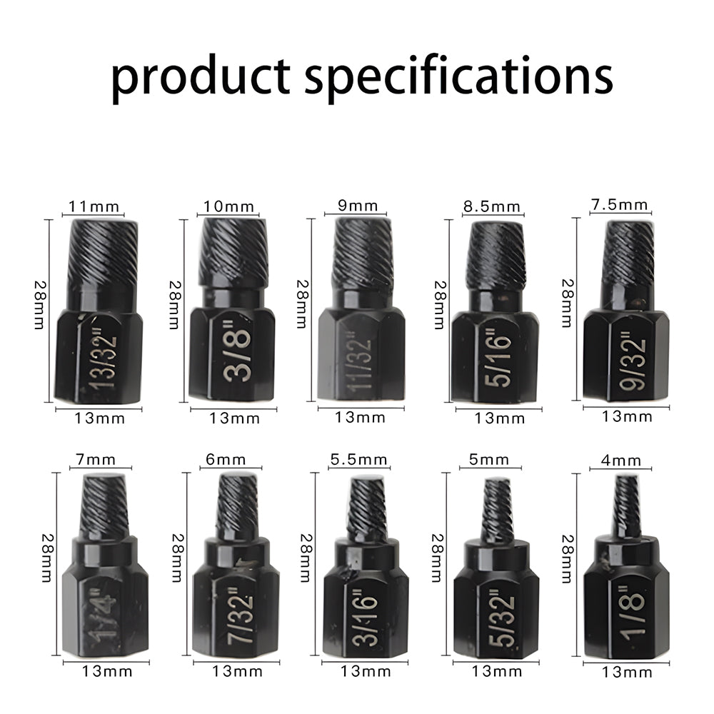 - ✔【10-Piece Screw Extractor Kit】This Bolt Extractor Set includes a range of sizes from 1/8 inch (3.5mm) to 13/32 inch (10.3mm), with increments of 1/32 inch.