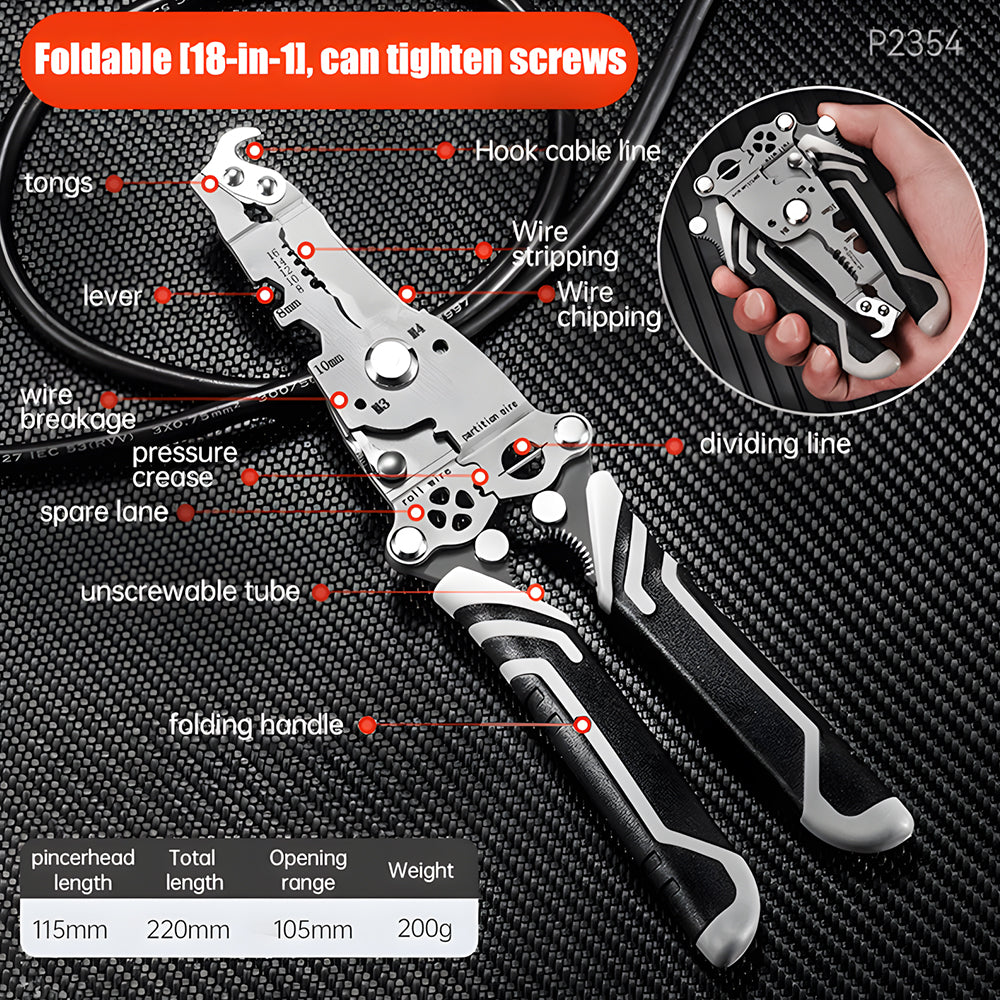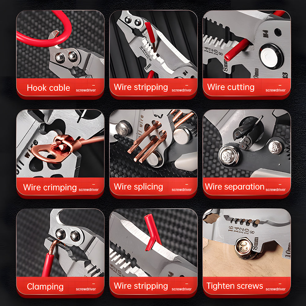 It can meet various electrical operation needs such as wire cutting, wire stripping, crimping, wire winding, wire splitting, clamping, wrench, etc.