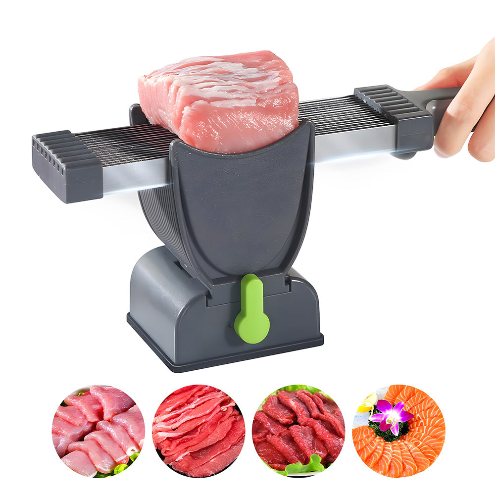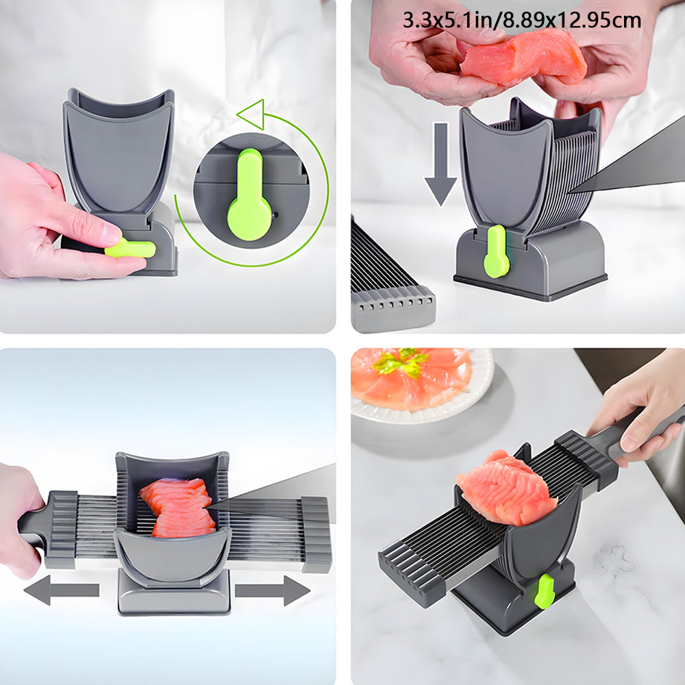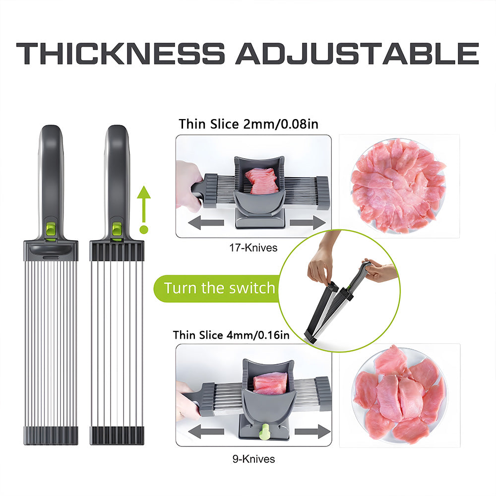 ONCE GET 18 SLICES: Themeat slicer set is the ultimate tool for precision cuts with 17 blades, easily cut a fresh meat into 18 thin slices in one stroke, compatible with a variety of fresh meats including pork, beef, chicken breast, and salmon....(not suit for frozen and deil meat)