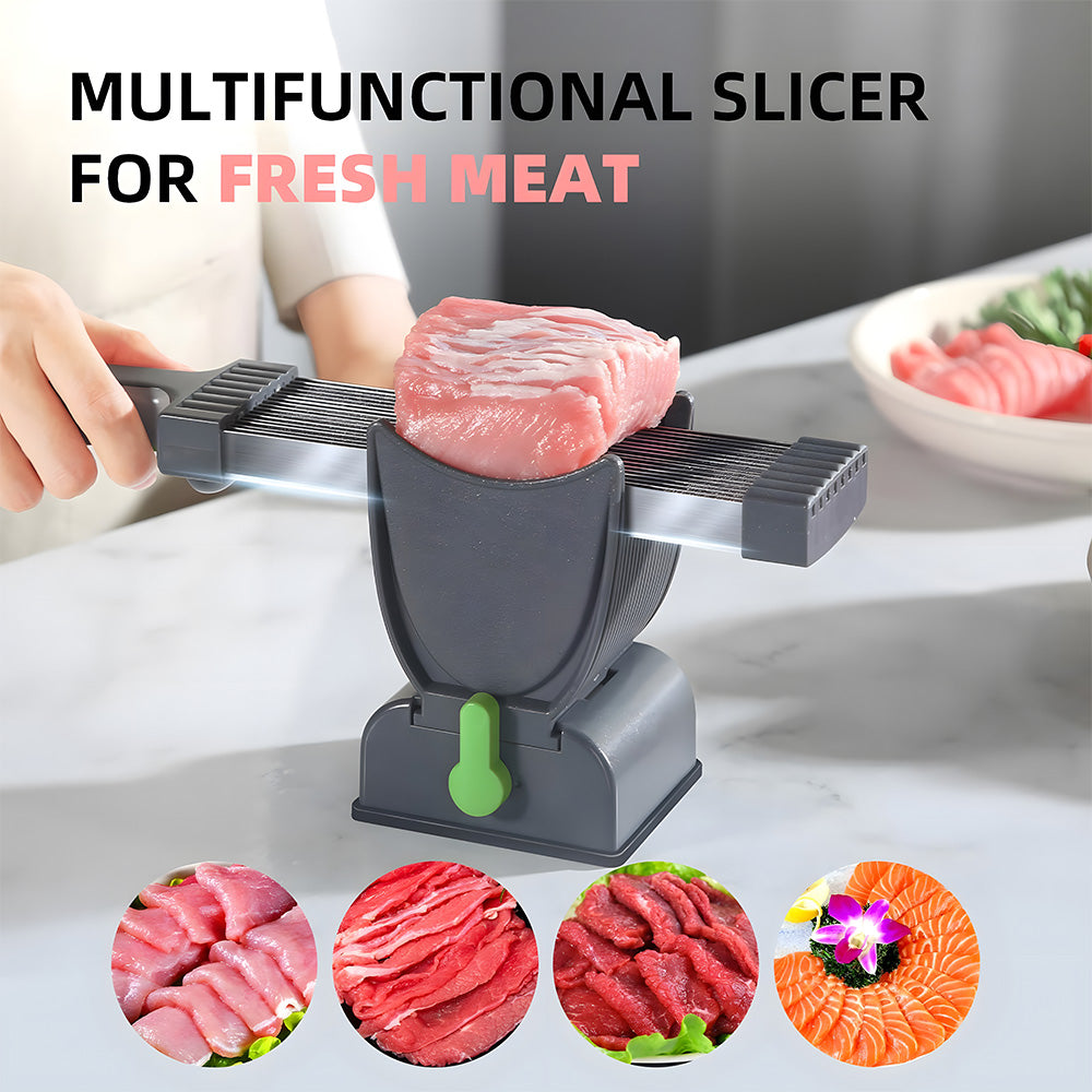 THICKNESS ADJUSTABLE: This manual meat slicer for fresh Meat comes with 2 blade sets, Enjoy the flexibility to cut meat slices at 2 or 4 mm, put the meat slices back into the container cut again get meat strips, dices, enjoy delicious food easilylike hot pot, black pepper beef, salmon sushi.tips (these blades are not suitable for frozen or bone-in meat)