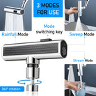 - 3 Water Flow Modes: The waterfall kitchen faucet offers three water flow modes, including Rainfall Mode, Sweep Mode, and Stream Mode, designed for washing vegetables, tackling oil stains, and cleaning kitchen utensils, respectively. You can switch between these modes by rotating and using the button to match different usage scenarios.