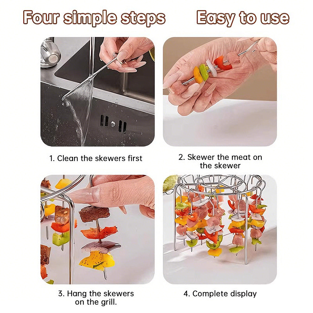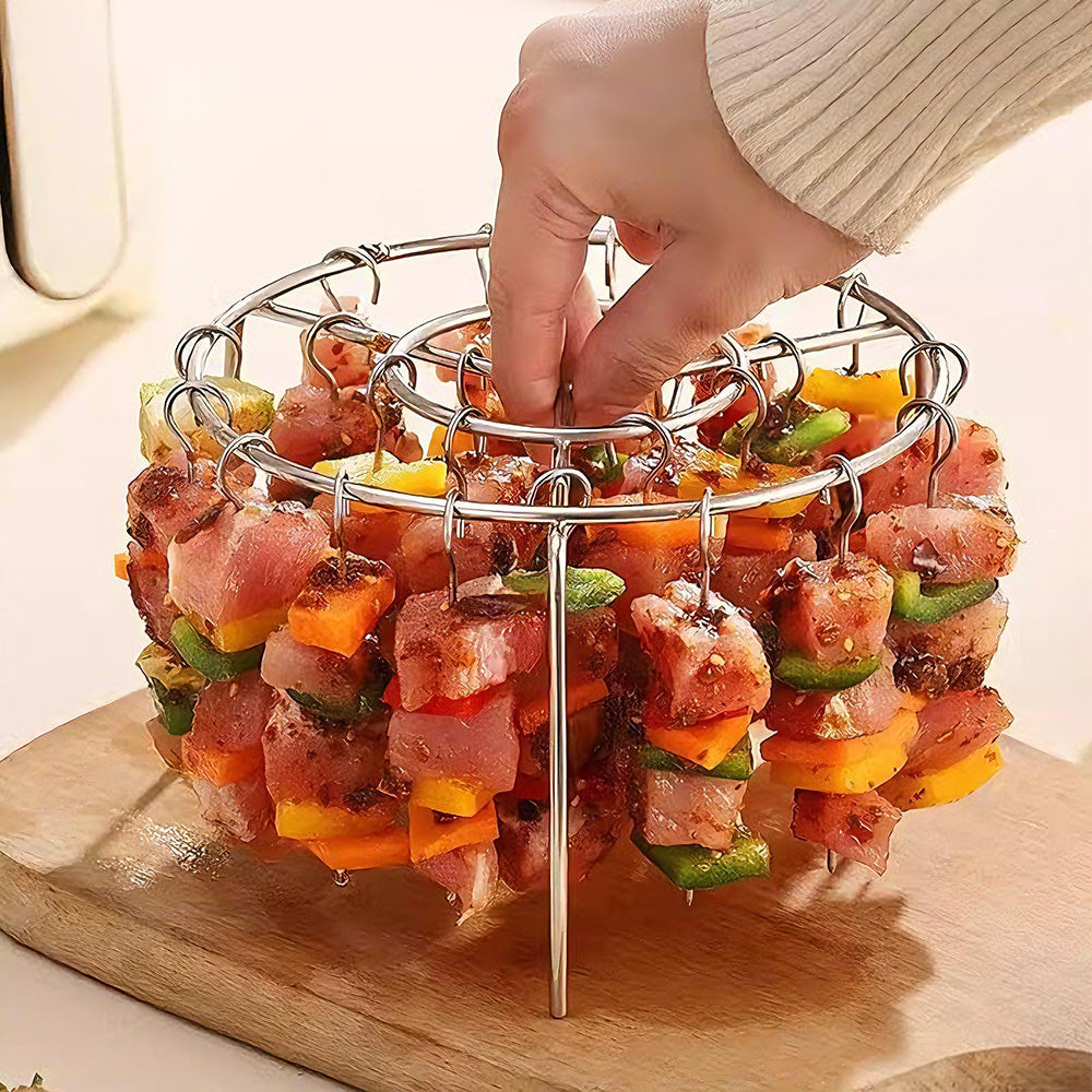 Say goodbye to blotchy veggies or half-raw meats—this rack ensures vegetables and meat skewers cook uniformly, locking in juiciness and flavor.The secret lies in its food-grade high-conductivity alloy (3x faster than regular metals!) paired with a bottom ring-shaped heat-gathering groove. Heat radiates from the center outward, wrapping each skewer like an "invisible insulation layer." Whether it’s paper-thin mushroom slices or thick pork belly, they’ll absorb heat evenly in no time—locking in moisture for that perfect "charred outside, tender inside" texture.