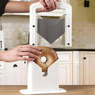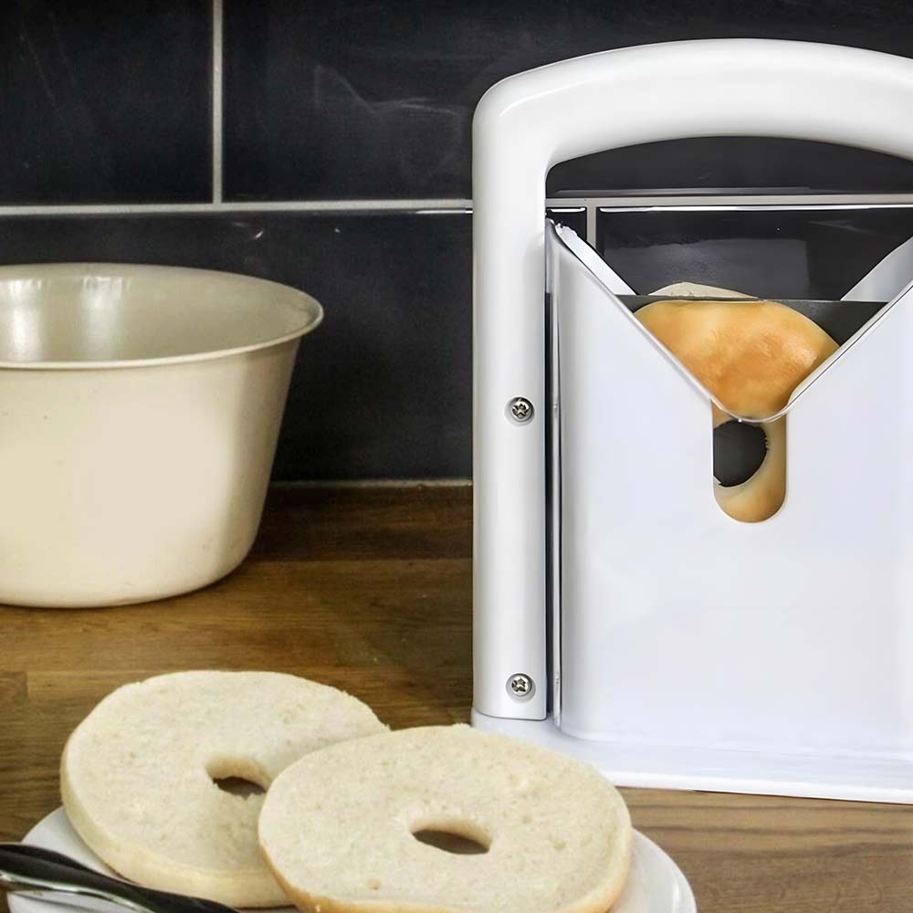 Efficient Bagel Slicing: Safely and quickly slice bagels in half with minimal effort and maximum safety.