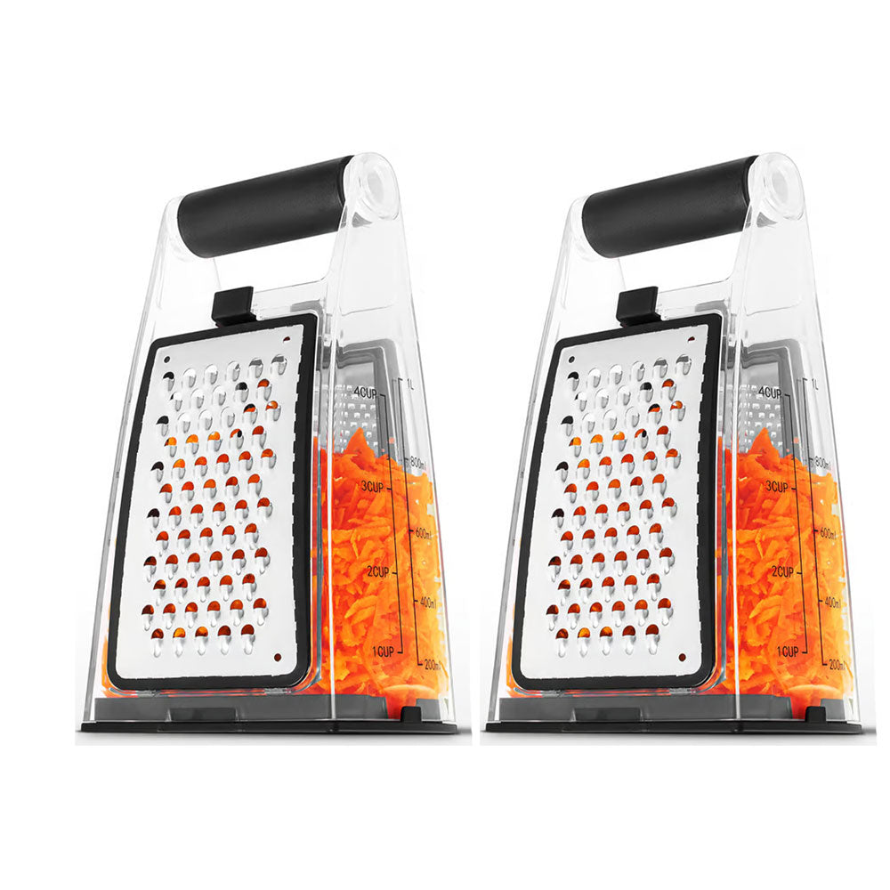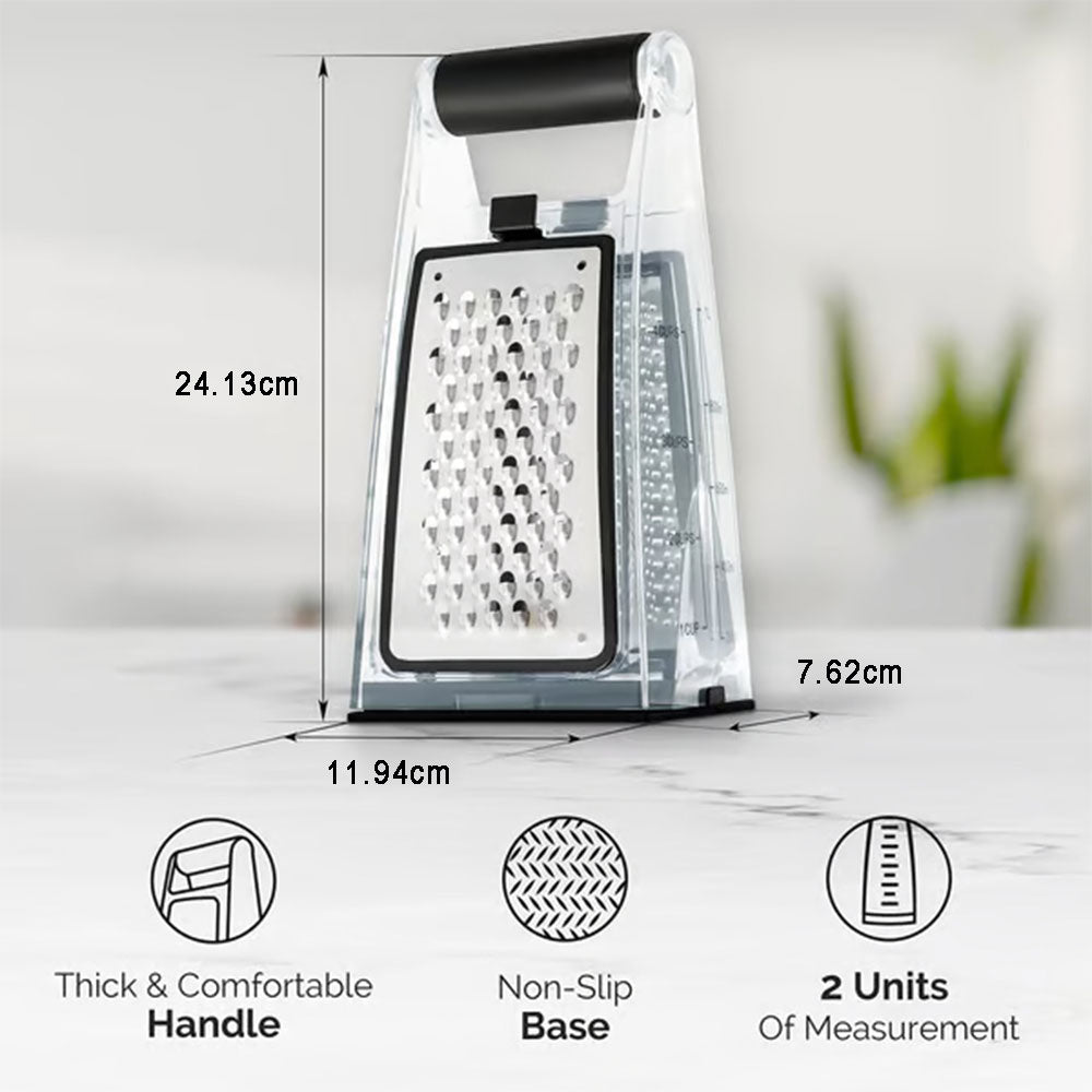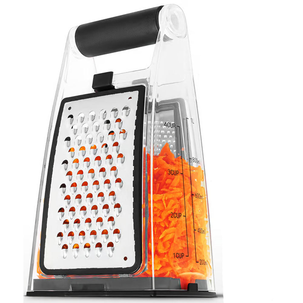 - Cheese Grater With Storage Container And Measurements. The smart base of this potato grater saves you time and space by storing your freshly grated food, while the clear sides provide two units of measurement: cups and milliliters. There's no messy kitchen, no need for extra utensils to grate into or measuring devices. The non-slip base and thick handle provide grip and comfort.