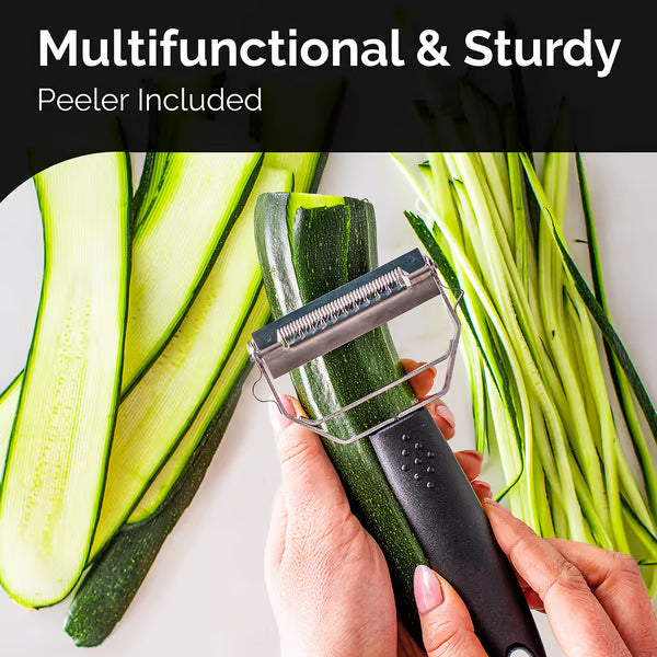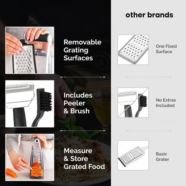 - More Than A Food Shredder And Peeler. Includes 3 different grating surfaces, removable non-slip base, 2 different measurement units, a thick and comfortable handle, and an additional vegetable peeler. This versatile kitchen gadget will streamline your cooking by multitasking as a ginger grater, carrot shredder, parmesan cheese grater and much more.