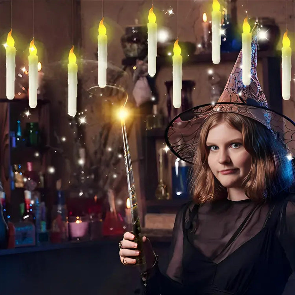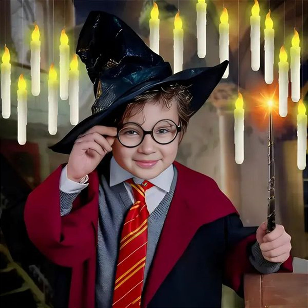 Gif your children wonder with our LED Flating Flameless Candles,controled by a magic wand remote, They!l wield enchanting powers ligting up occasions ike birthdays andHalowen. These candles mimic rea one, waing genty in a captivating glow, while the wand ets them control flickering patterms and brightness. Safety s ensured with LED tec- no heat or smoke. Let them revel in magical moments, creating unforgettable memories in a blend of creativity and enchantment.