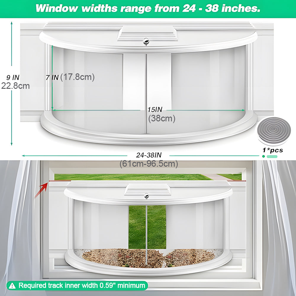 - COMPATIBLE WITH VARIOUS WINDOW SIZES: Bird feeder for windows is 15 x 9 inches. Suitable for single and double windows 27-38 inches. Easy to assemble and disassemble. Slide the board into the window rail. Slide the boards on both sides to adjust the appropriate length. Enjoy the company of your feathered friends.
