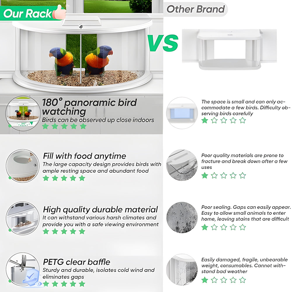 - HIGH-QUALITY AND DURABLE MATERIALS: high-quality wood with PETG transparent baffle. Strong and stable. Withstands various harsh climates. Equipped with foam sealing strips. Keep the cold wind away. Avoid gaps. The bird feeder inside the window provides you with a safe viewing environment.