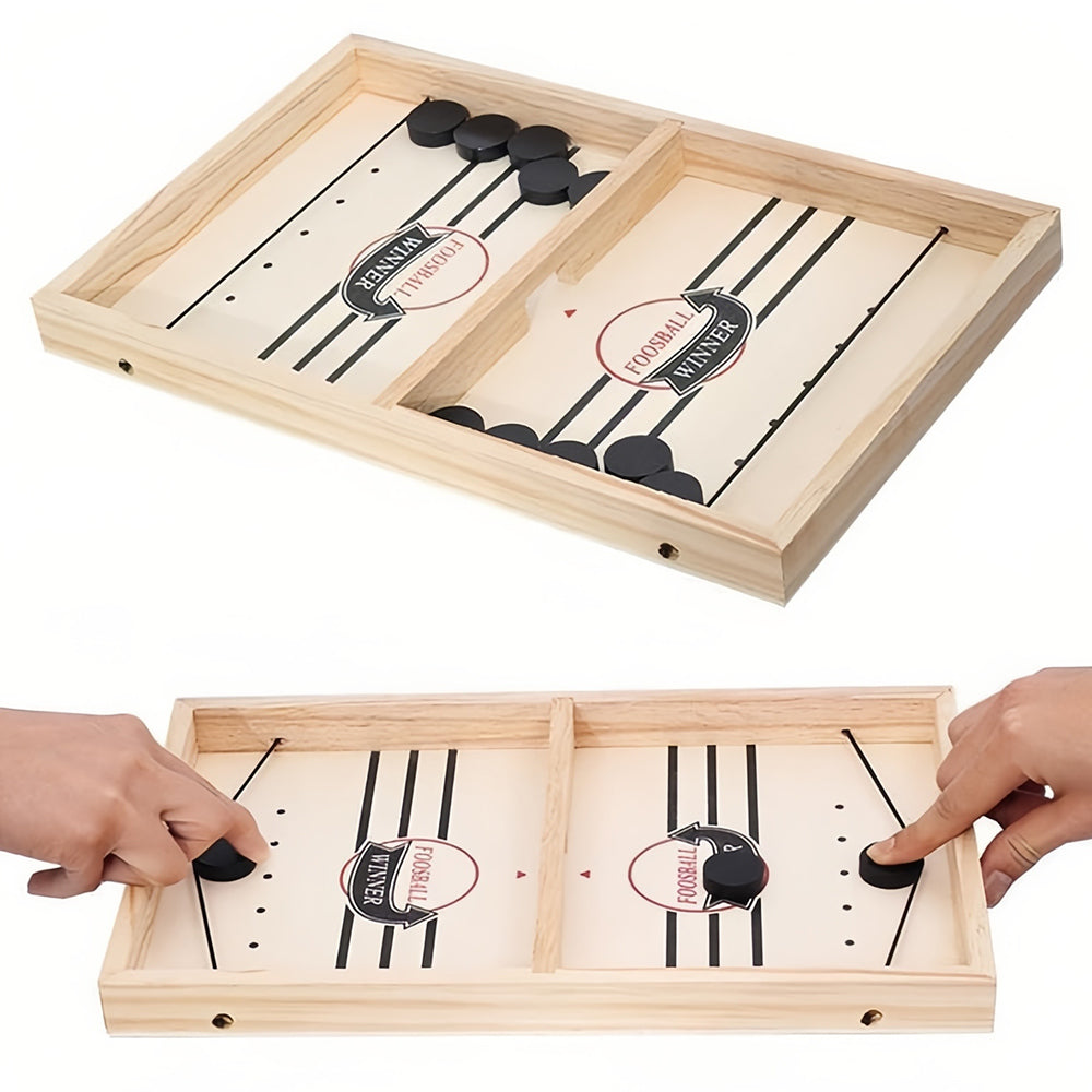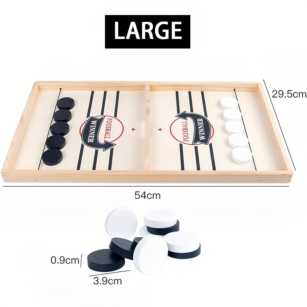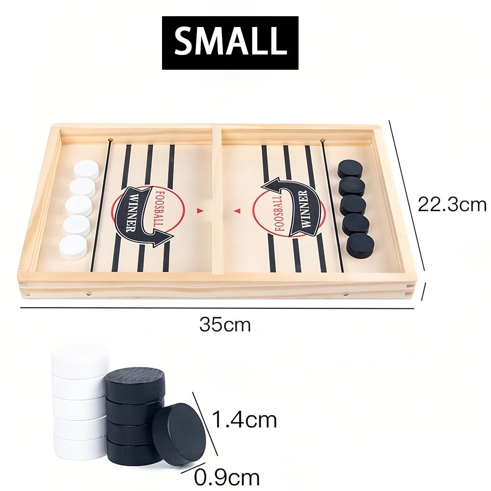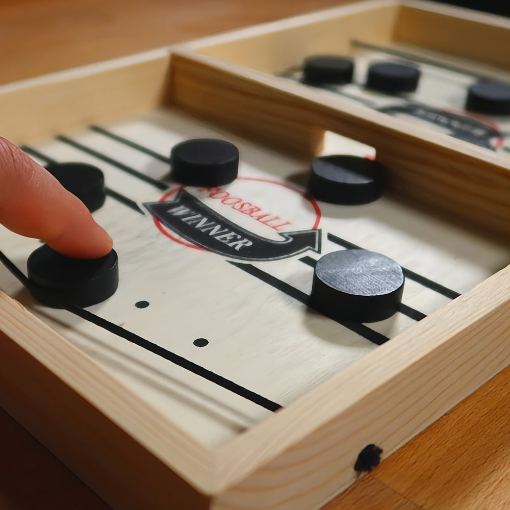 A game full of speed and action where the goal is to pass all the pucks to the opposing player's side of the split board. However, the process only has to be done with one hand and the discs have to be pushed through the opening to the other side using the rubber band! AVAILABLE IN SMALL OR LARGE!
