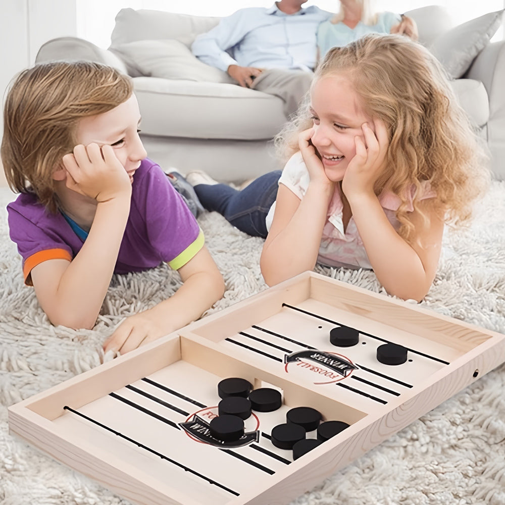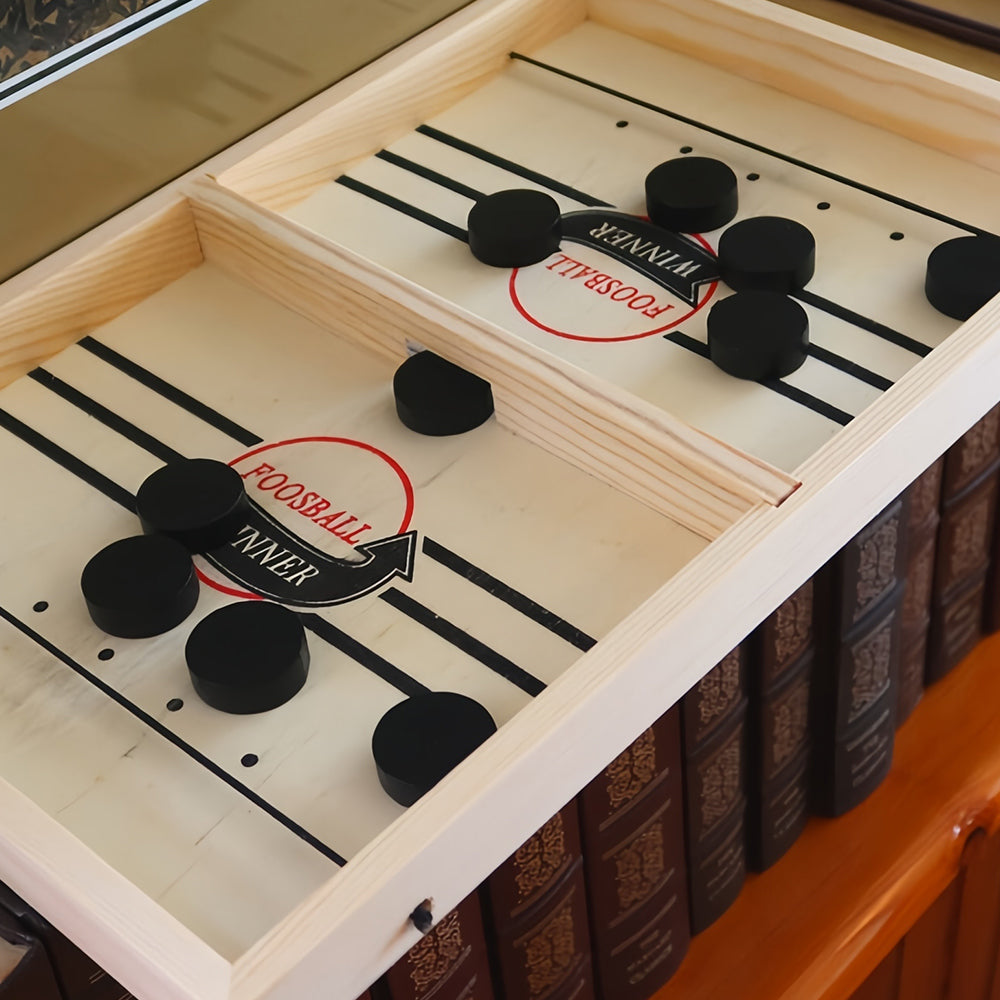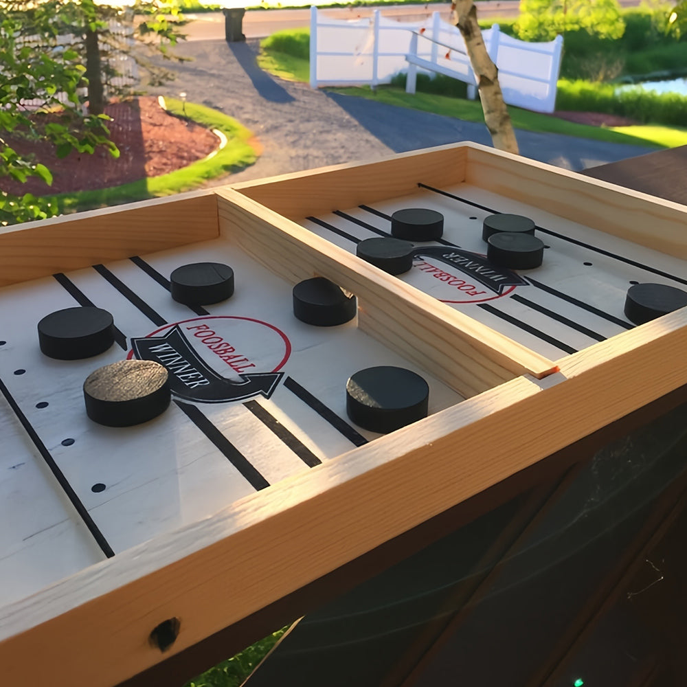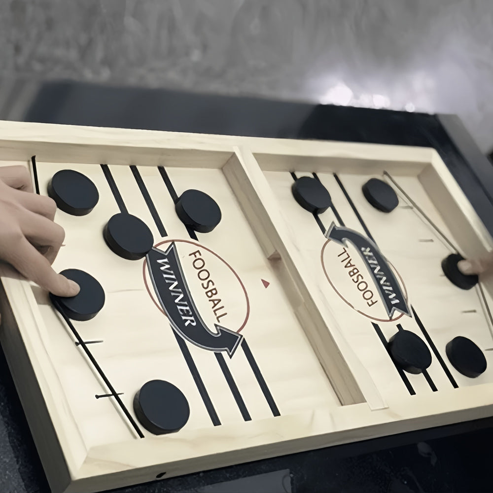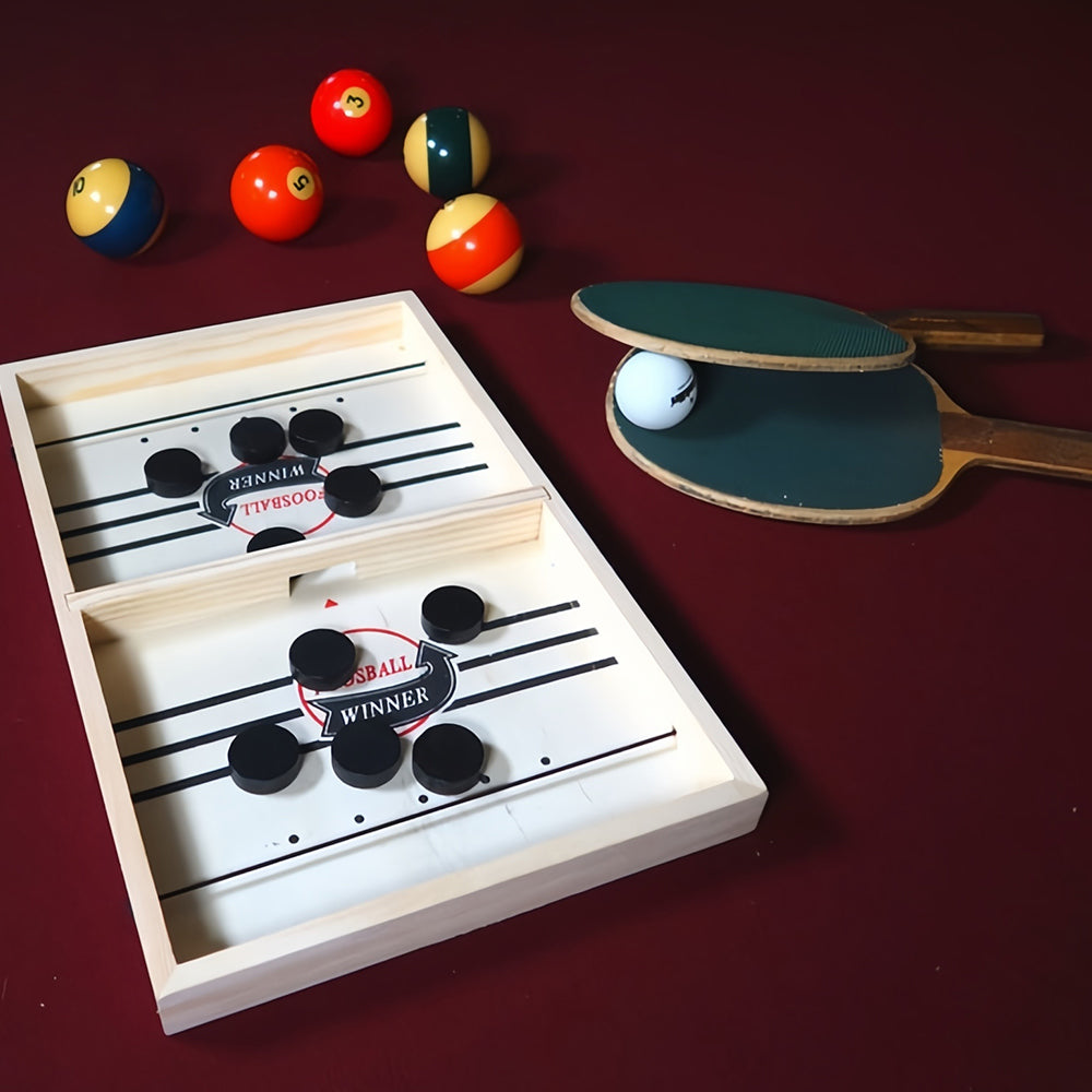 A game full of speed and action where the goal is to pass all the pucks to the opposing player's side of the split board. However, the process only has to be done with one hand and the discs have to be pushed through the opening to the other side using the rubber band! AVAILABLE IN SMALL OR LARGE!