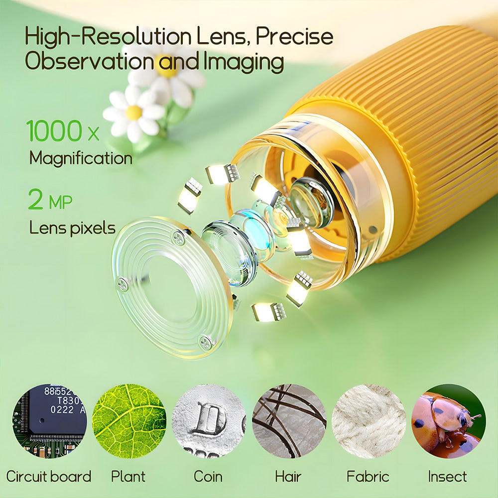 【Adjustable LED Lights】This children's microscope is equipped with eight LED lights designed to illuminate the subject. This feature ensures the production of clear, bright images and videos, maintaining optimal visibility even in low-light conditions.