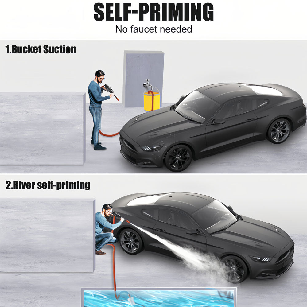 - Self-priming design saves you from the worries about water supply, you can easily get water from any tank or faucet, and the filter avoids the clogging problems. With complete accessories to get the cleaning job done.