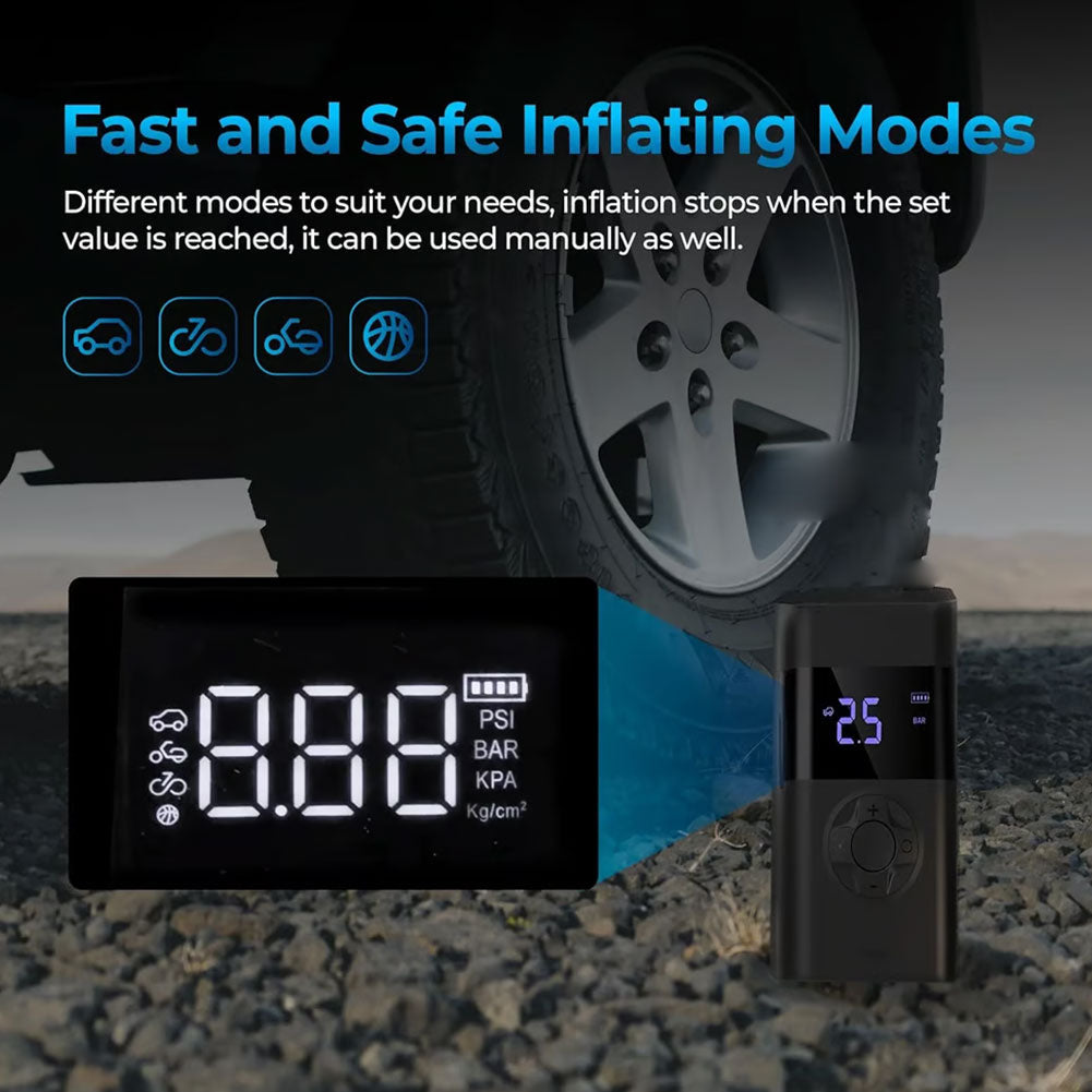 - User-Friendly Interface: The portable air compressor for car tires The power button turns the unit on and off, while the mode button allows you to switch between different inflation modes.